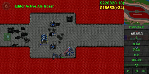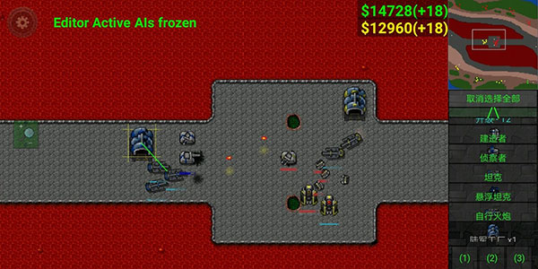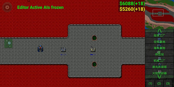 6、使用激光坦克(图片情况是假的),因沙盒模式原因很难模拟正常情况,因为钱不够的原因四号要出激光坦克在激光防御上有极大欠缺,三号只需火炮集火激光坦克,并用建造修塔,而四号的激光坦克难有输出机会大概率白给,为减小损失回收二级陆工,三号顺利拿下中。以上为我遇到的对抗火炮的方法,均以失败告终,目前尚未遇到能对付的方法(好像只有我一个人用,那就叫雪风式火炮流好了)。