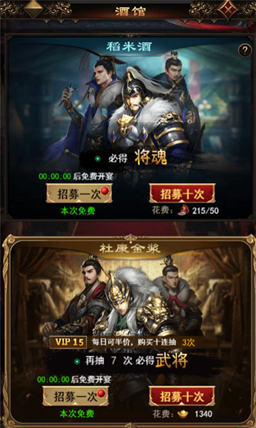 5、 二者均有免费次数,杜康金浆24小时恢复1次免费,稻米酒8小时恢复1次免费