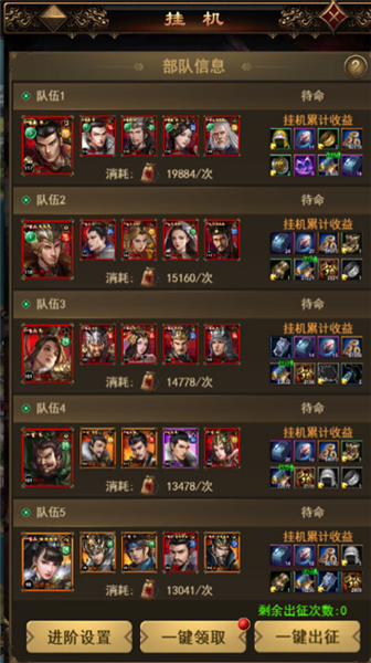 1、挂机是自助战斗的辅助系统,是玩家挂机打城战的必选项,首先,玩家可以根据已有武将进行自主编辑好5支出战部队,每支部队5个武将;然后玩家可以选择部队的出战次数,最低1次,最多99次;在选择出征之前,玩家还可选择指定军团城池作为进攻对象。
