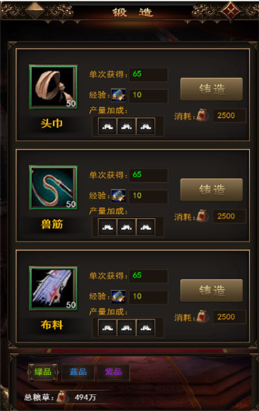 3、 根据玩家等级可锻造绿品、蓝品、紫品等武将训练材料