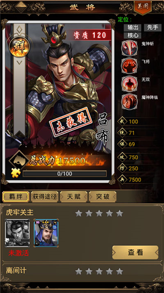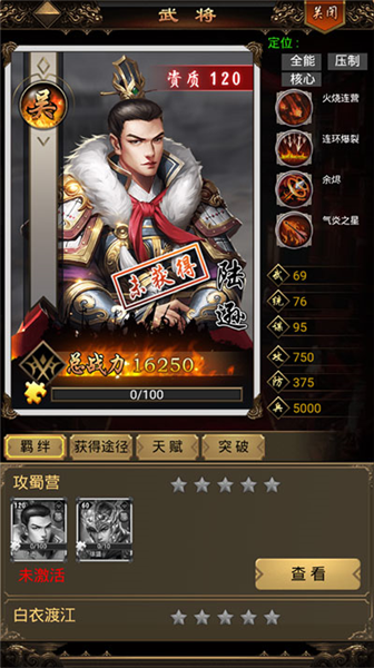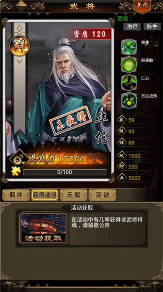 5、谋士:辅助的类型比较多样,包括输出加成,恢复兵力,削弱敌军等。以华佗为例,属于恢复兵力和削弱敌军型。技能1,青囊:恢复己方全体武将的200%攻击兵力。技能2,麻沸散:攻击时有几率令目标获得麻醉效果,每秒减少怒气,效果结束时目前被眩晕3秒,辅助型武将要求玩家较高的策略意识,是团队中不可或缺的一部分。