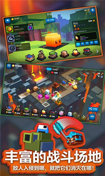 1.独特的视觉风格:《方块塔防》采用了简约而不失精致的方块风格设计,每一种塔和敌人都有其独特的方块形态,这种设计不仅让游戏界面看起来清新脱俗,也使得玩家能够迅速识别出场上的各种元素。