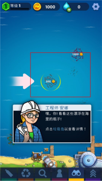 1、在本站下载安装并打开放置海洋清理师游戏,进入游戏,玩家首先需要查看岛屿中漂浮的垃圾。