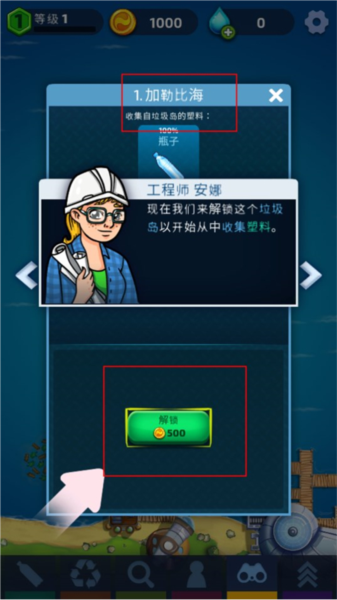 2、然后使用金币解锁垃圾岛,清理岛屿里的各种垃圾。