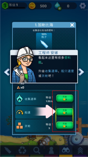 3、同时玩家还需要使用进行来升级自己的收集速率、船速、货仓等装备设施。