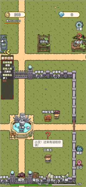 1、开局先捡取艾族长上面的宝箱,里面有1000金币,30钻石等,后面会用到。完了,再跟艾族长对话做任务。任务主要是引导的基本操作流程,艾人的老玩家可以快速跳过。