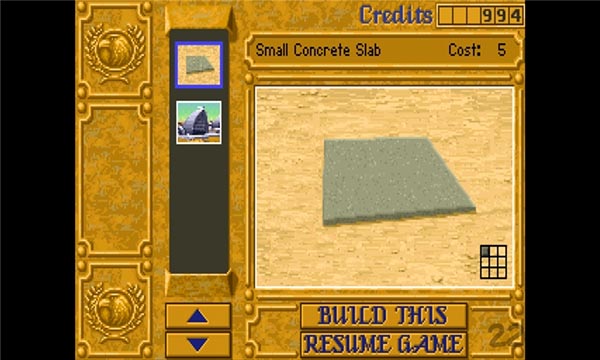 (1)混凝土地基:有4格和9格两种,作用在于增强建筑物的防御能力,如果没有混凝土地基,建筑物造好后就仅只有一半的防御力。必要建筑为基地(Construction Yard)。建筑物如果没有完全建造在地基上,则所受损伤无法修复。对地基进行升级可以建造更大面积的混凝土地基。其防御力中等,大多数武器都可以毁坏地基。地基受损后无法修复,只能替换或废弃。
