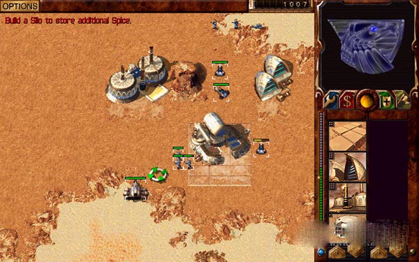 (13)香料罐(Silo):必要建筑为香料精炼厂。用于储存已经采集到的香料,香料精炼厂完成了香料加工后,会将之分配到各个香料罐。若所采香料超过了容量,则多余的香料会丢失。香料罐遭攻击、摧毁或者占领,其中的香料也会丢失。装甲轻型,可为大多数武器所破坏。