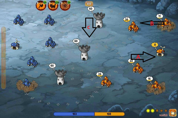 C箭头标注的就是 哨兵营 (自动攻击路过的 敌方士兵)