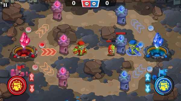 3、除了僵尸特工,关于另外两种模式基本都是对抗挑战,水晶塔防将展示个人的头脑策略,可选择的三条进攻路径极大的提高了战术的趣味性,而且操作上同样仅需一指便可操作,只不过出兵的方式有点奇特,玩家需要合理控制按压的力度来完成出兵,其中控制在不同的区域可以实现出战的类型也不同。