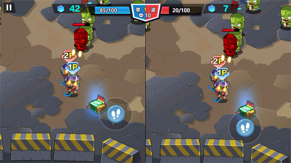 双人大作战是一款支持双人联机游玩的射击游戏,采用2D卡通风格。玩家们可以一起组队对抗成群的僵尸,这里的僵尸会一直出现,且会随着波数不断增加难度,非常考验玩家之间的配合。同时也有塔防模式可以体验,这个模式操作相对轻松一些,但是很考验策略。此外还有爽快的对战模式,看看谁才是最强的特工。