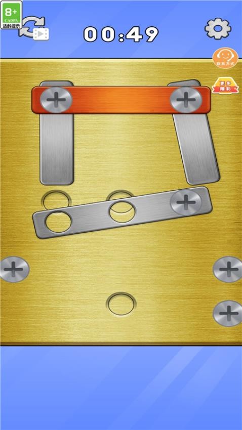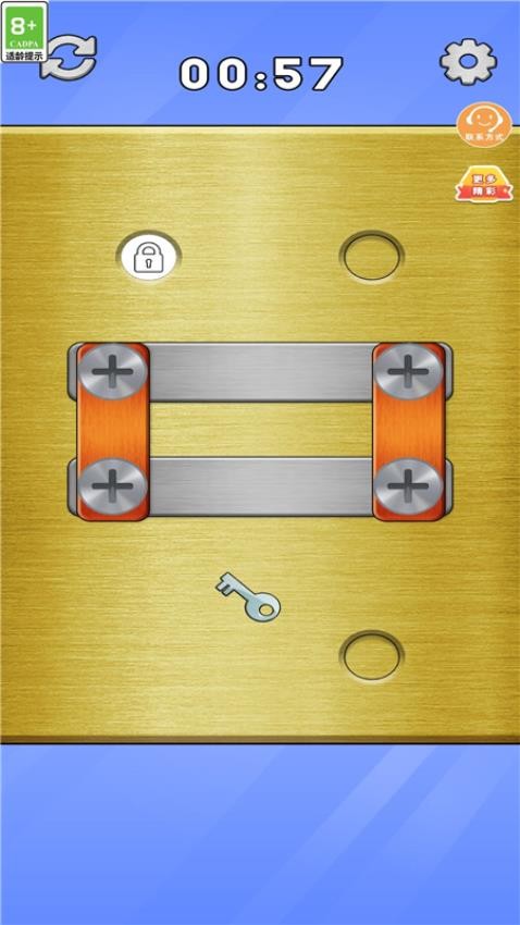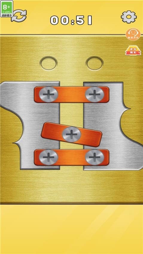 这是一款休闲有趣的闯关类游戏,主要操作玩法就是拧开螺丝,每个关卡中都是由不同的铁片贴合在一起,你要把所有的螺丝拧下来把贴片拆开,关卡的难度是从低到高,还是非常由趣味性的,不同的关卡限制的时间是不同的,一定要在规定的时间完成挑战。