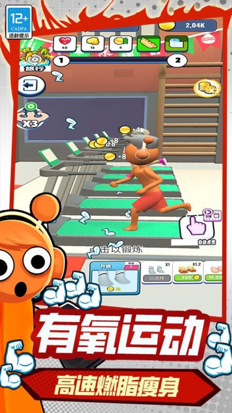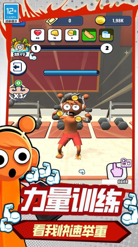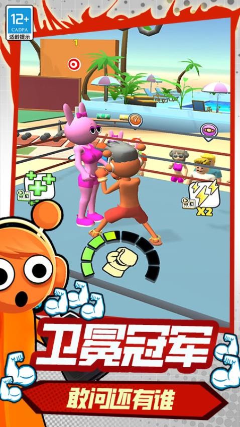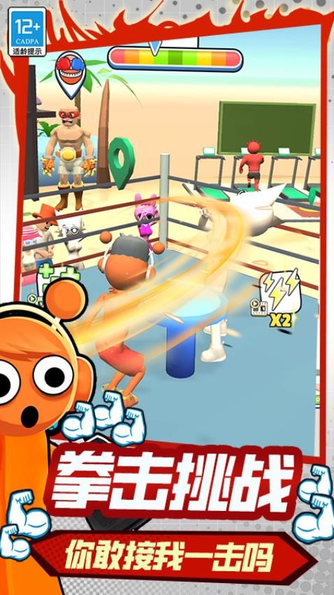 玩家操控可爱的橙色小人在拳击场展开拳击挑战,迎接各种对手,感受激烈对战。还能在健身房进行高效健身,通过力量训练快速举重提升实力。此外,有氧运动助你高速燃脂瘦身。游戏融合拳击、健身等多种元素,带来丰富体验,助你成为肌肉猛男,享受运动乐趣。