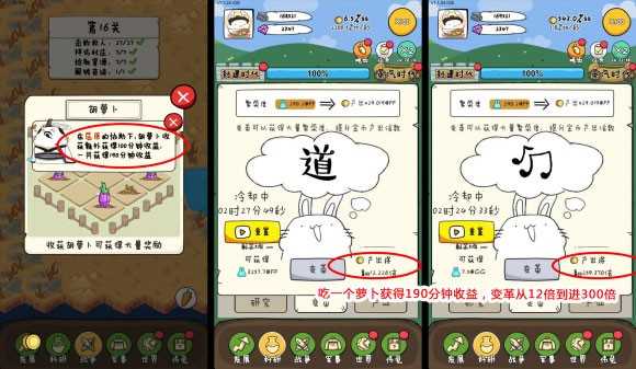 完成上述升级后,可自由点选其他非核心项目,兼顾资源收集与进度推进。随后切入萝卜获取环节:战争结算、早晚餐事件、周末神兽挑战等均可阶段性提升金币收益与繁荣度,但切记不可连续食用萝卜或连刷挑战单次萝卜带来300倍增幅,若连吃两次仅为600倍叠加,而吃一次即变革一次,则达成300300=90000倍质变。