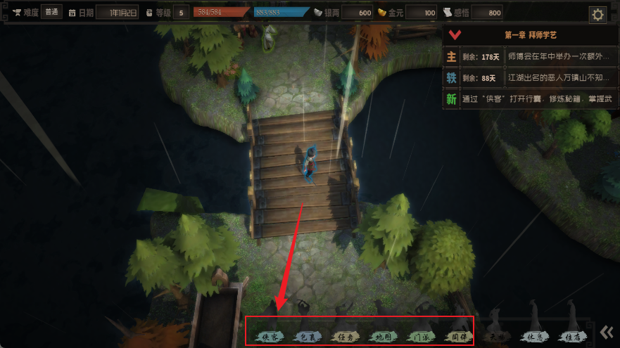 6、经过两个月的历练,就能着手进行支线任务。推荐挑战襄阳野林”的万镇山”,不仅能获得吐纳法”内功秘籍,还有天赋点奖励。完成首个支线后即可算是真正入门。此时可选择接取掌门的送信任务、继续闭关或与其他弟子切磋,灵活安排进度。送信任务能积累贡献值,用于兑换心仪秘籍。