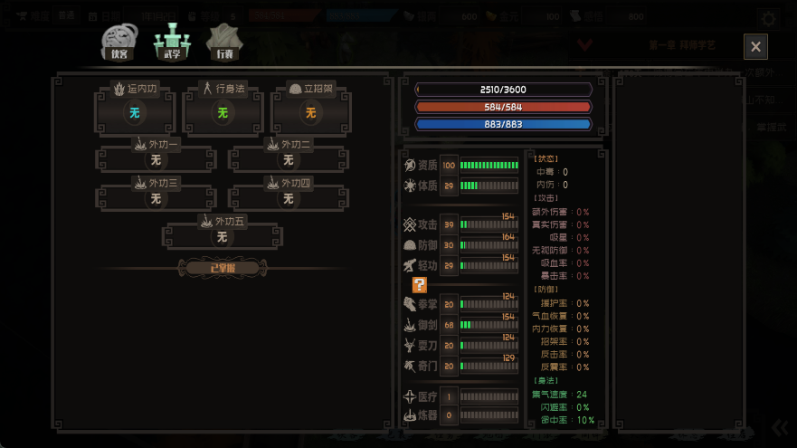 3、进入游戏后,按照引导依次打开【侠客】、【行囊】和【秘籍】界面,先学习基础心法,比如轻声法”气络决”或血脉心法”。随后与掌门对话领取一本铁布衫”。再前往门派的闭关圆盘”,通过闭关积累感悟值,用于提升秘籍等级(最高可升至10级)。