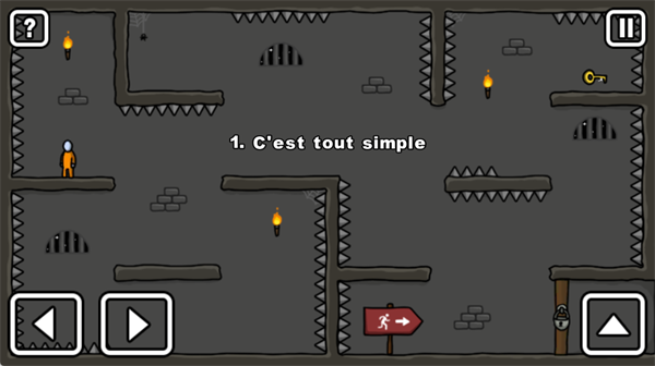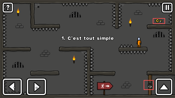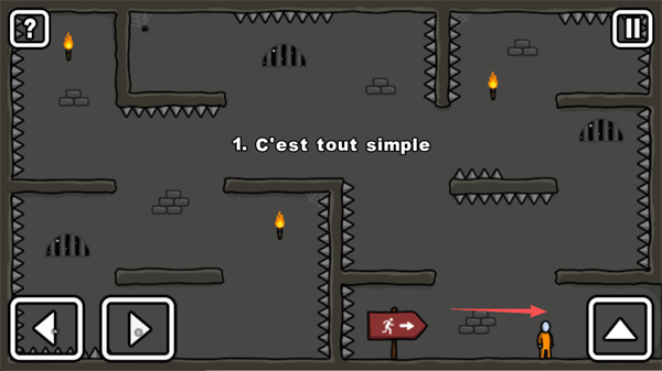 在第1关「Cesttoutsimple」中,玩家需要操控火柴人成功获取钥匙并打开出口大门,同时注意躲避沿途的尖刺陷阱,确保自身安全。