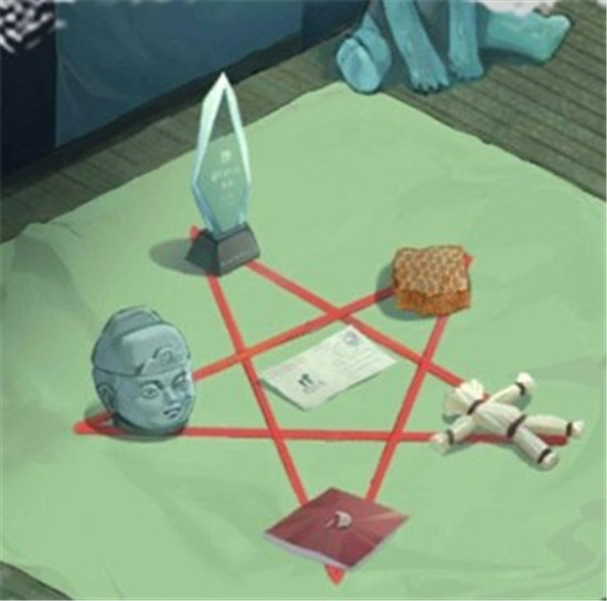 7.原因:书上有写对应的阴寒之物放置最上方并且属水,石像很明显属土,稻草人属木,指甲属火,蜂巢寓意为富贵,所以属金。