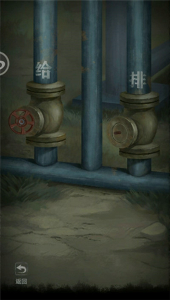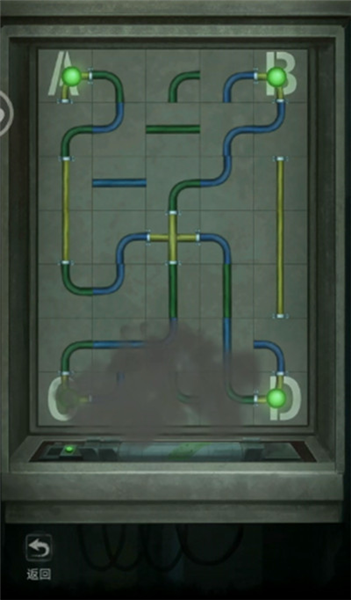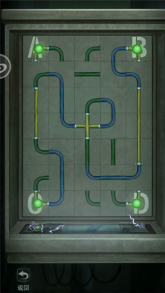 7.回到剧场右门,将转轮安到装置下方左边,将电容安到装置上。游玩接水管小游戏,然后电容烧坏了。
