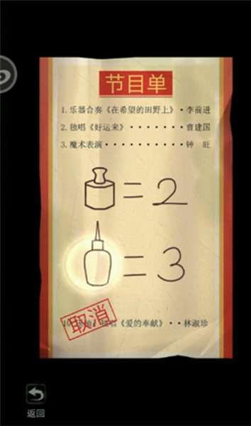 15.回到剧场,在妈妈的脚的右下方点击节目单,用碘液点击节目单,得到两个物品的重量。