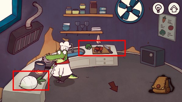 7、来到鳄鱼家,点击桌上的萝卜,点击菜板上的刀(任务:需要3个胡萝卜)