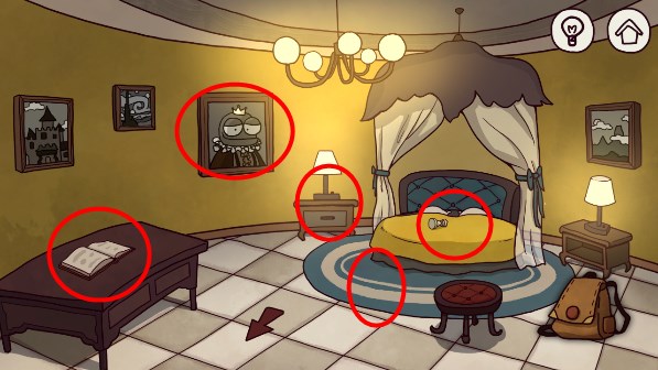 14、进入城堡内部二楼,点击床上国际象棋,获得国际象棋点击柜子,拿到榔头,点击地毯,有纸片,点击画框,有密码锁,点击书本,每页都是解密道具,翻到最后一页,将之前放进去。