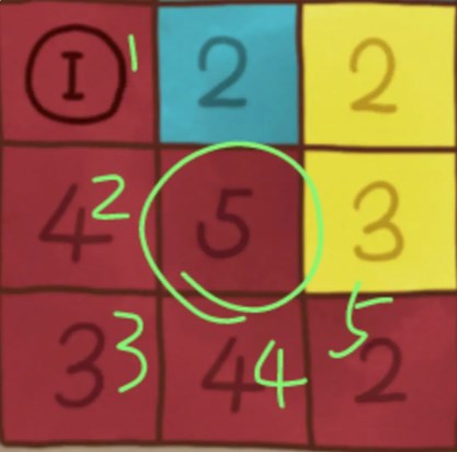 17、点击暗门,输入密码,进入房间密码:3642,看到类似于扫雷的玩法,九宫格中间的数字代表在周围中有几个相同颜色的方块。除中心点的其余8个格子有几个颜色和中间颜色相同的,如下图: