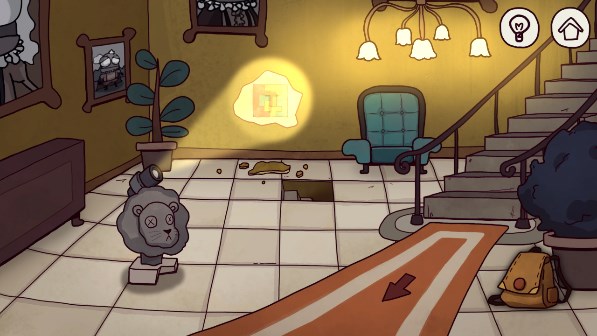 15、下楼来,点击沙发获得国际象棋,点击投影,放置电池,投影位置有榔头的标记,用榔头砸了,榔头砸完的区域为解密道具,可以先解,解完记下来。