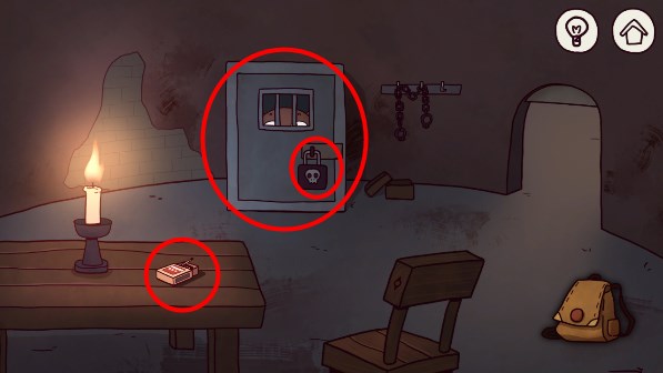 3、找到城堡的地下室,要用道具桌上的火柴,蛙蛙卧室墙照片后面的密码箱子里面有钥匙可以打开牢门,绳子用道具刀隔开,记得绳子也是道具要一起拿上。