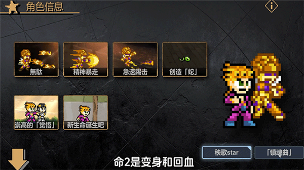 JoJo的同人格斗是由B站up主孟队打造开发的一款玩家自制横版格斗游戏。游戏是以热门动漫ip《JOJO的奇妙冒险》来改编,采用像素的画风,极致还原了人物、场景的特点。以复古的街机格斗对战为核心,玩法仍然有趣且不过时,而且还加入了全新的内容,为游戏带来新鲜感。游戏战斗爽快,玩家可以选择各种动漫里那些熟知的角色,每个角色都有特定的技能和机制,通过合理的点击按键顺序从而搓出华丽的连招,轻松击败对手。