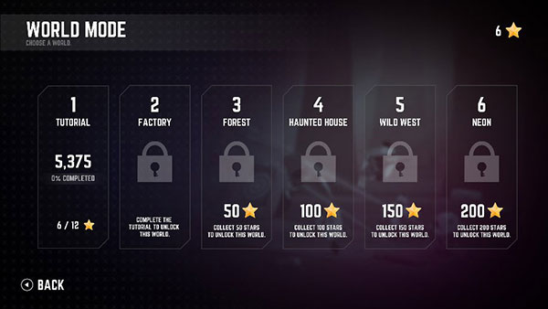 1、世界模式在此游戏模式中,您必须在电池耗尽之前到达每个级别的终点线。世界模式带你穿越5个不同的世界,每个世界都有自己独特的装置和敌人,它们会试图摧毁你。每个世界的最终关卡都是一场大boss战。