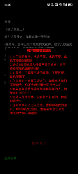 规则怪谈诡异旅店是一款文字冒险的恐怖游戏。世间总是被各种大大小小的规则控制,维持平稳,而你这次将来到一家诡异旅店,这里也有写满一张的诡异规定,旅馆主人需要你遵守规定,否则就会迎来灭顶之灾,可是面对这些奇怪或是相悖的规则时,一种恐惧感让你起了鸡皮疙瘩,你决定要对这间旅馆展开探索,依靠自己的行动决定是否要遵守规定,游戏里的每一个选择都会对故事结局产生影响,走向完全不同的两个结局,是死是生,请你收集好线索,充分思考,做出你认为的最正确的决定。