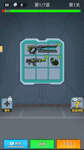 1、进入游戏,点击开始,将武器拖拽在格子中,相同的武器可以合成升级,安置好武器即可展开对战。