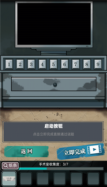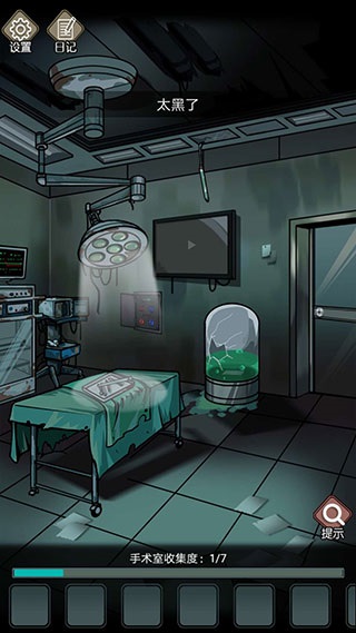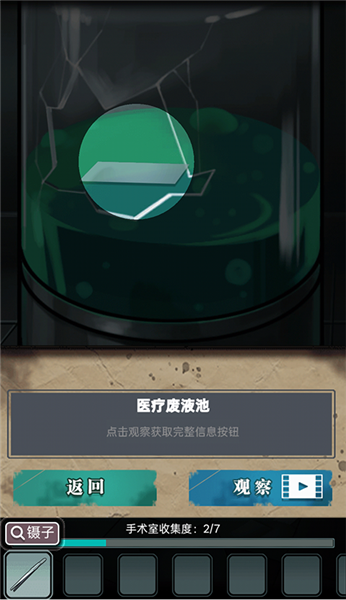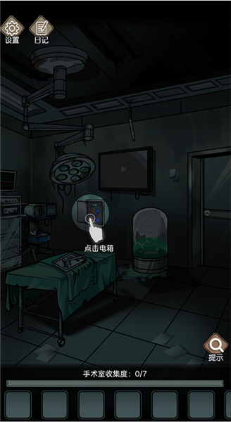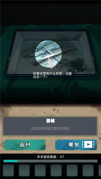 3、下面的进度条告诉我们手术室有7个谜题,谜题之间层层相扣,在这里我们点击器械来获取道具。