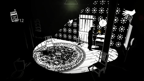 step9:在木门里的房间找到一台放映机,将四个画面全部浏览一遍。之后可以在窗户外面射进来的光形成的十字影子的中心找到一把地下室的钥匙。