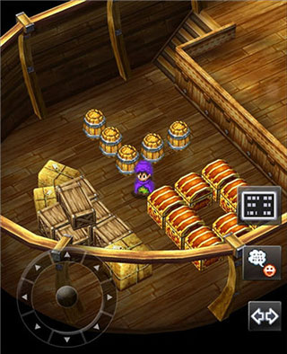 走出房间我们发现,原来我们是在一艘船上,这里需要我们调整一下视角才可以看到船帆后面的木桶,经常玩rpg游戏的玩家应该都和小编一样有个习惯,那就是每到一个场景都要把各个地方都搜刮一遍,玩勇者斗恶龙5也不例外。在开始的房间和甲板上我们先把柜子、图书架以及这些木桶全都搜查一遍,可以获得一些道具和物品。