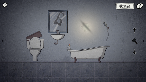 8、回到浴室里面,将刚才获得的灯罩放在蜡烛上将其罩住,接着使用DV机会出现提示,根据提示用撬棍将墙壁打破,将墙壁打破之后拿走里面的锤子。