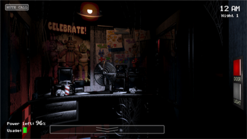 1、第一夜主要是教导玩家一些玩具熊的新的玩法,虽然是教学关卡但是对于刚进入这个游戏的玩家来讲还是有一定的难度。时间还是从12点开始,一开始玩家主要要做的就是查看左右房间的门,在这一关中间的门基本上是不用顾及的,这一关怪的主要来源还是从左右两侧的门进来 1