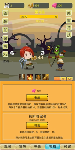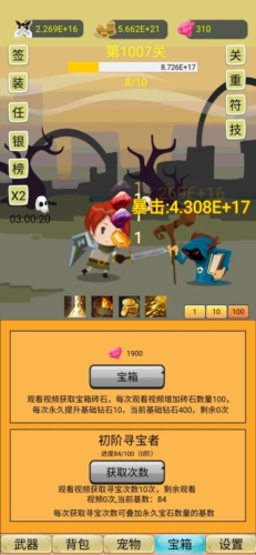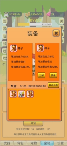 10、宠物:共有12只,第一天把钻石宝箱获取可以全部获得宠物,属性推荐顺序如下:暴击值(未满1000之前)>金币收入>武器强度,暴击伤害 酌情升级。