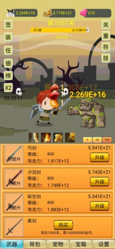11、武器:武器可以通过三种石头升级,分别是强化石、铸造石还有升星石,这些在推关或寻宝的过程中都有可能会掉,满足条件时武器会显示可提升,点进去,看哪个石头够就点哪个升级,武器现在有一键升级了,非常方便,还有x10,x100的金币升级设置,也很方便了。