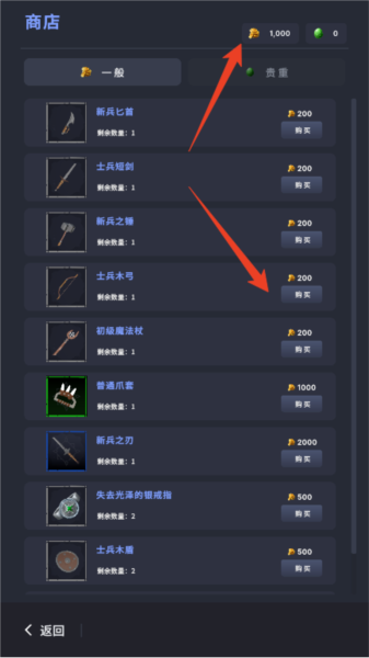 5、然后再去商店看看,初始有1000金币启动资金,能买一些装备,但也可以不买,先玩玩每个职业再决定。