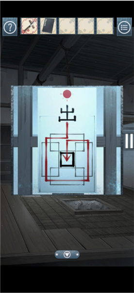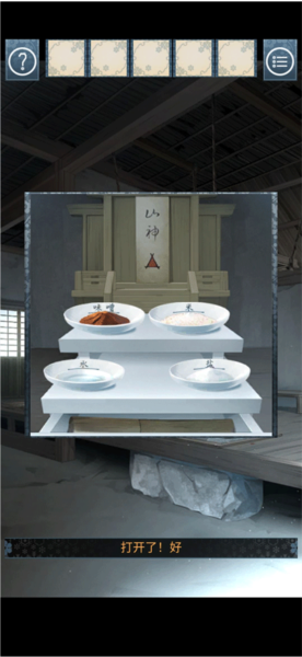 就近原则,先来到厨房把架子上的盐和灶台上的米装好,然后来到井边装上水,最后来到有一幅画的房间装上味增,不要着急回去,再去看看游戏最开始的地方,发现三个果实后面有图案,点进去以后记下来,然后回到拿衣服的房间