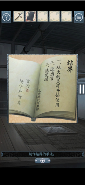 打开柜子以后用刀划开,得到符咒和场地,根据书里的内容反向操作,正常按照符咒首字来读,应该是来春去冬,反过来就是冬去春来,把冬去春来输入到场地里,减轻门上的力量,然后根据从大的符咒开始按反过来,就是从小的符咒开始点,从小到大点完以后门开,剧情。