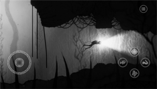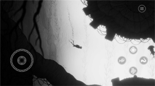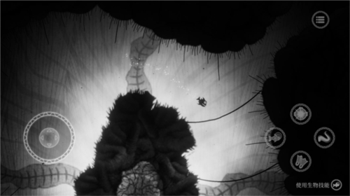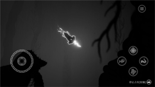 3、接下来介绍操作,屏幕左边控制角色移动,屏幕右侧触手图案是占有技能,鱼图案对应海洋生物能力,头盔图案是探照灯,脚蹼图案是加速。