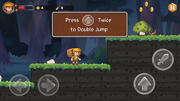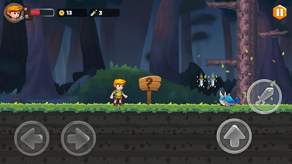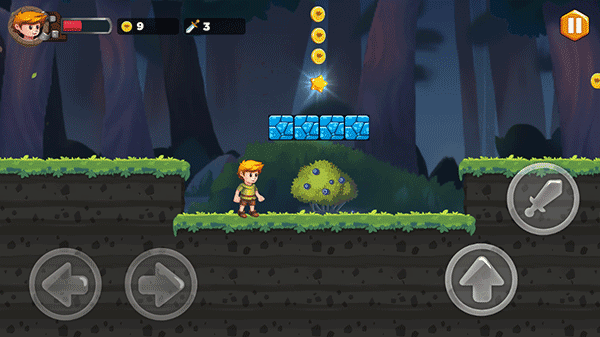 2、经典的操作方式,左下角控制左右方向,右下角跳跃领取金币。如果你拿到武器,发射按钮就会出现。