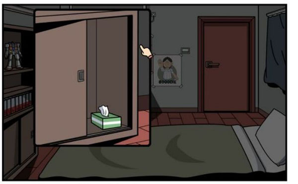 首先打开左侧柜子下方的柜门,拿取纸抽,点击纸抽抽取20张纸后得到头部零件A。