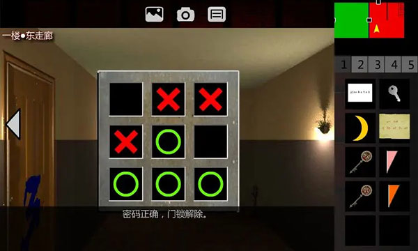 7、回到3F西侧廊,取走密码器上的【粉色碎片】。回到1F大堂。右转2次,用【3号钥匙】打开3号门,进入1F东侧廊。左转3次,上楼,进入2F东侧廊。右转3次,取走花盆旁的【橙色碎片】。左转3次,下楼,进入1F东侧廊。右转3次,点击密码器,原理是井字棋,你为先手,只要正确3个一组连线即可解锁。