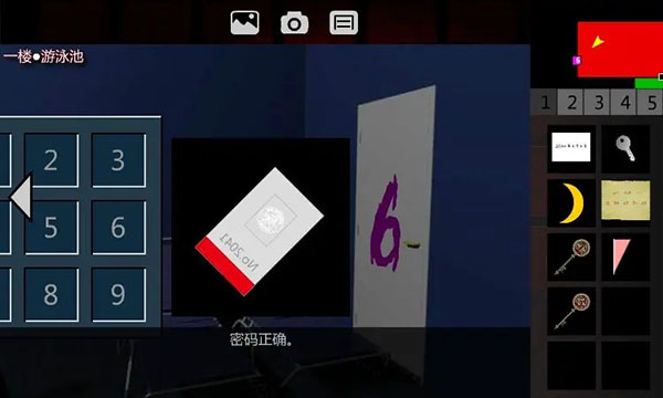 8、解开密码器,进入1F厨房。右转2次、点击窗户、翻窗,进入1F游泳池。右转,点击密码器,这是九宫格密码器,容易联想到电视机的字出现顺序。输入密码591274638(固定),取走【临时门禁卡】。回到1F电梯间。