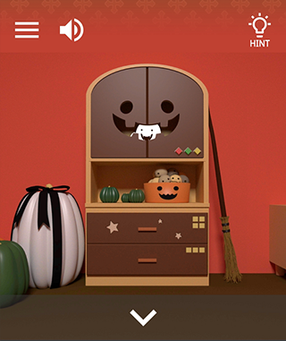 2、点架子中间的柜子,输入密码打开获得半片纸。后退点左边南瓜,记住南瓜表情,南瓜左边中间的书打开发现幽灵。