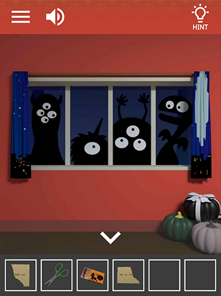 7、后退点右边窗帘打开,注意眼睛数量,再对缠着丝带的黑色南瓜用剪刀发现幽灵。